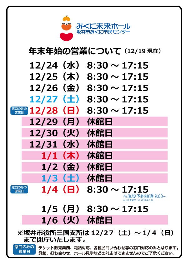 年末年始の営業についてお知らせ【みくに未来ホール】