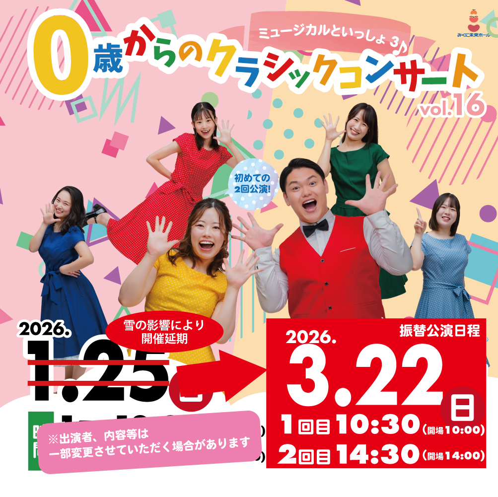 2026年2月23日 / 最終更新日時 : 2026年2月21日 みくに未来ホール お勧め商品 0歳からのクラシックコンサートvol.16チケット 0歳からのクラシックコンサートvol.16チケット (0cla_vol16_ticket_20260125) 注文番号タイトル(定価)販売価格(税込)在庫状態数量単位 0歳からのクラシックコンサートvol.16 〈開演10:30~〉(¥500)¥500在庫有り 0歳からのクラシックコンサートvol.16 〈開演14:30~〉(¥500)¥500在庫有り FacebookXBlueskyCopy